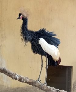 Crowned cranes (Balearica pavonina pavonina) are named for the striking, straw colored bristle-like feathers on top of their heads. They are mostly black with white